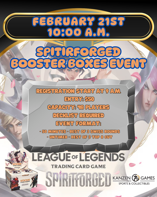 KanZenGamesOriginal price $50.00 - Original price $50.00Original price$50.00$50.00 - $50.00Current price $50.00Only 6 left!Riftbound TCG Spiritforged Booster Boxes EventFebruary 21st @ 10:00 A.M. Please read the following carefully: - Date: February 21st @ 10:00 A.M.- R...